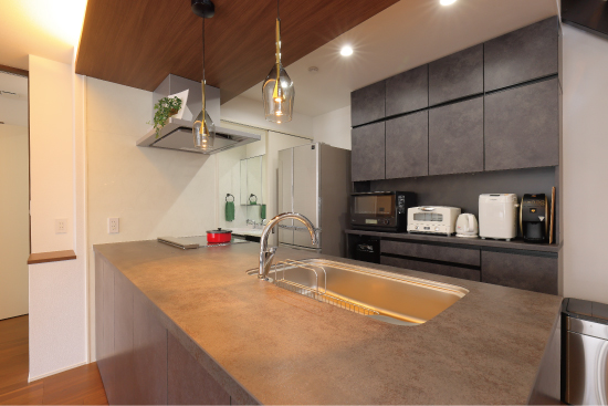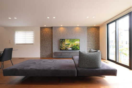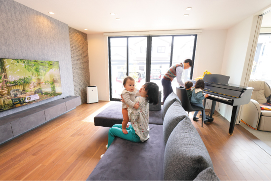 デザインのテイストには、ご主人のアイデアが盛り込まれています。リビングのアクセントクロスには外壁用のタイルを組み合わせ、重厚感のあるタイルが存在感を醸しています。設計やインテリアの担当者と打合せを重ね、安全性や予算を考慮しながら実現させました。壁や柱のないLDKは、キッチンに立つ奥さまから、窓際で遊ぶお子さまたちがはっきりと確認できるほど見通し抜群です。
