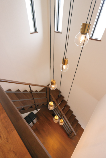 吹き抜けホールには、高さを生かしたペンダントライトを設置。昼と夜で雰囲気がガラリと変わります。
