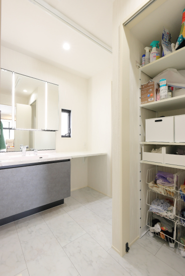 脱衣室をコンパクトにした分、洗面室に収納を確保。家族全員分の着替えや洗面用具のストックはココに。