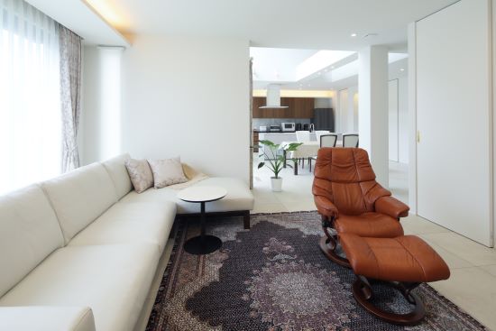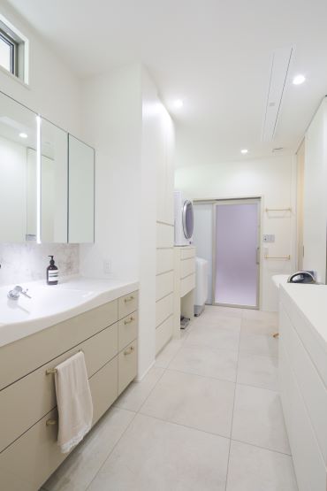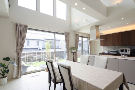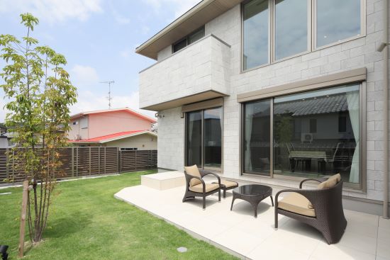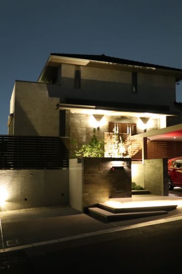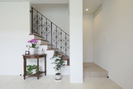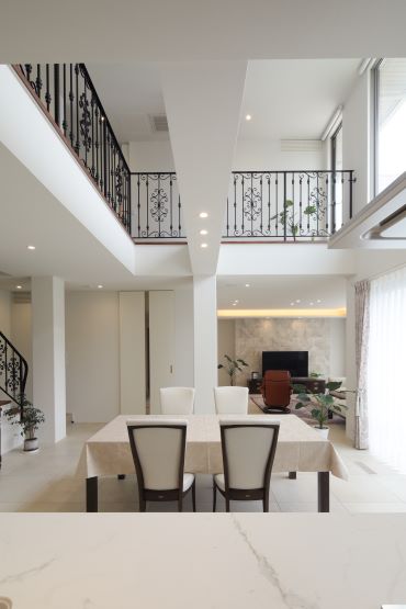 2階建 繋がりが生まれる家 「この場所、素敵ね」の一言からはじまった新居は、 “縁”のつながった場所 1.ダイニング上に設けられた贅沢な吹き抜け 2.アウトドア気分を高める広いテラス 3.毎日の生活動線がスムーズになる効率的なプラン 家族構成/ご主人、奥さま 建 物/シンセ・スマートステージ 廊下をできるだけ少なく空間をできるだけ広く 居住スペースを最大限まで広げた間取りにすることで、家事動線など室内での移動もスムーズに。ダイニング上に設けられた贅沢な吹き抜けが、1階フロアに開放感と明るさをもたらしてくれています。 空間にさりげなくデザイン性をもたらす階段の存在感 LDKから2階へと上がる階段にアイアンの手すりを採用。 アクセントに1段目のステップだけにタイルを使用しました。 階段そのものが、まるでオブジェのようにLDKを彩ってくれています。 ダイニング上の大きな吹き抜けのまわりに回廊を設けることで、さらに空間を“大きく”見せています。 脱衣所を広く、収納やカウンターを設置。洗濯後にその場に干して、さらにアイロンがけもできて効率的。 計算して設置された間接照明がやさしく照らしてくれる夜の外観。明るすぎず暗すぎず、ムードのある雰囲気です。 キーワード 吹抜け 家事ラク動線 自然や庭を楽しむ 車と楽しむ 面積 45坪以上