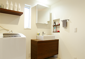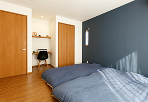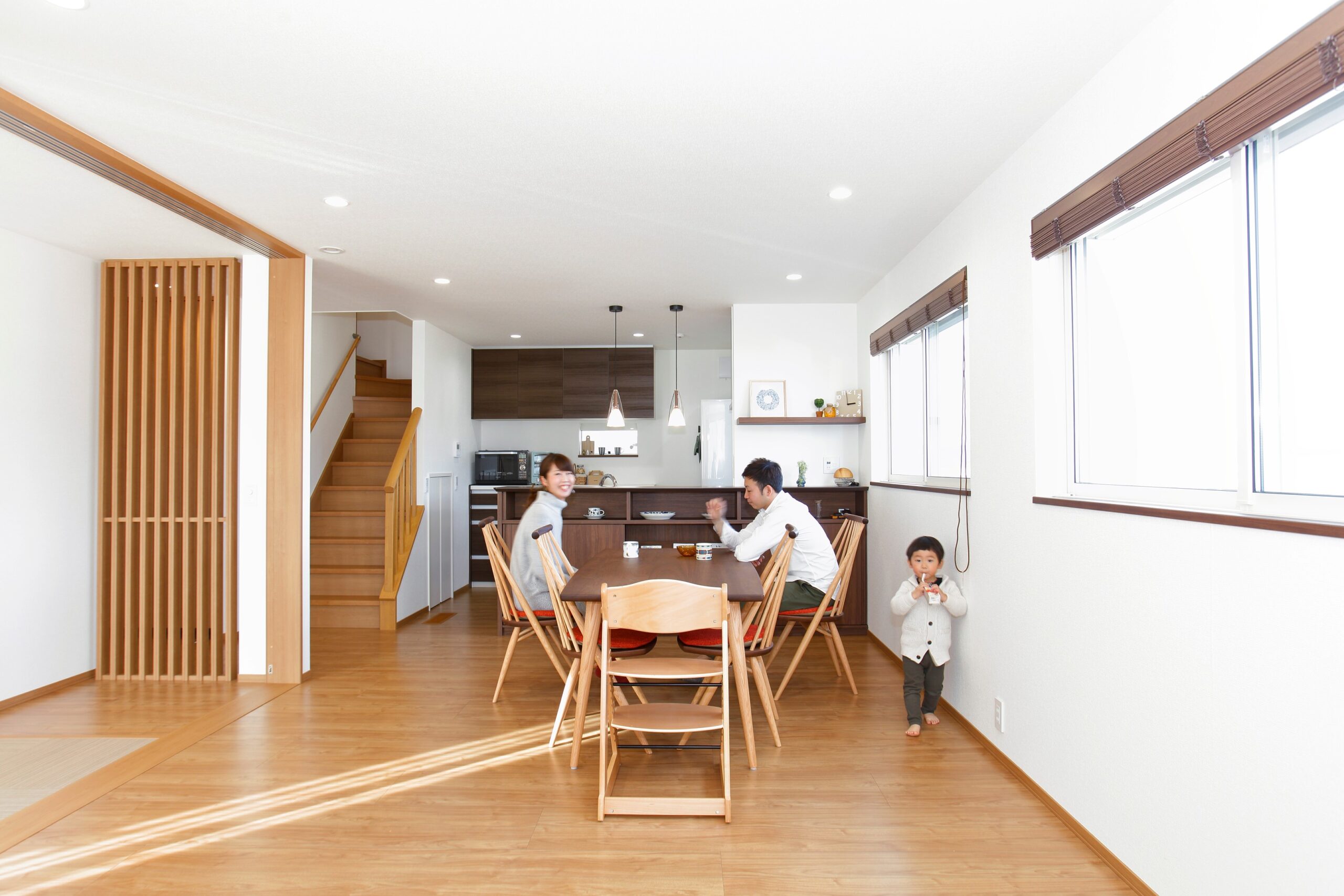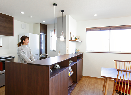 2階建|延床 約91坪|敷地 約38坪 マウンテンビュー × つながるリビング 眺めの良い高台に建つ、髙橋様の住まい。 家の東側に広がる空と、遠くまで連なる山々がどこからでも一望できるよう、リビングの東側に窓を並べました。 また、リビングや和室で過ごす子どもの姿を、キッチンに立つママがひと目で見渡せる「つながるリビング」が、家族の絆をはぐくみます。 1. 開放感のある立地を活かしたプランニング 2. 空間につながりが生まれるアイディア 3. 360°美しい北欧インテリア 家族構成/ご主人、奥様、お子さま1人 竣工年月/2017年8月9日 建物/シンセ・はぐみ 敷地面積/301.58㎡(91.22坪) 建物面積/1階:67.70㎡ 2階:59.61㎡ 延床面積/127.31㎡(38.51坪) 子育て世代に安心の広々View 大きな空間・開口部がつくれる鉄骨ラーメン構造ならではのプランニング。 家の中の見渡しにもこだわり、LDKに接した和室は、壁の一部に縦格子を採用。 これによりキッチンや階段から、和室で遊ぶお子さまの様子がわかるうえ、暗くなりがちな廊下へ光と風を通します。 温もりある質感が美しいキッチン造作と北欧インテリア 家具のように温もりのある質感がリビングに自然と溶け込みます。 ダイニング側のオープン棚には、奥さまが好きな北欧の食器や雑貨が飾られ、住空間に彩りをプラス。 見せる棚と隠す収納をうまくレイアウトされたデザインです。 主寝室の空いた空間は、造りつけのカウンターや飾り棚を取り付けられ、ご主人の書斎コーナーに活用。 引き戸を開け放てば、リビングとつながる広びろ空間に。和室の床には、汚れに強いテキスタイルフロアを採用しました。 洗面脱衣室には、見せる収納のオープン棚とニッチを設けて日用品を収納。 キーワード 家事ラク動線 自然や庭を楽しむ 面積 35〜40坪まで