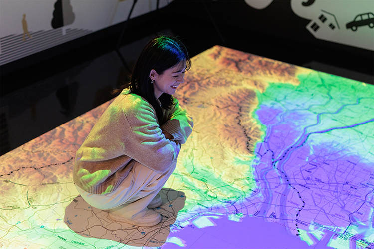 床に敷かれたマップを活用したプロジェクションマッピングで、南海トラフ地震の発生をよりリアルに感じることができます。