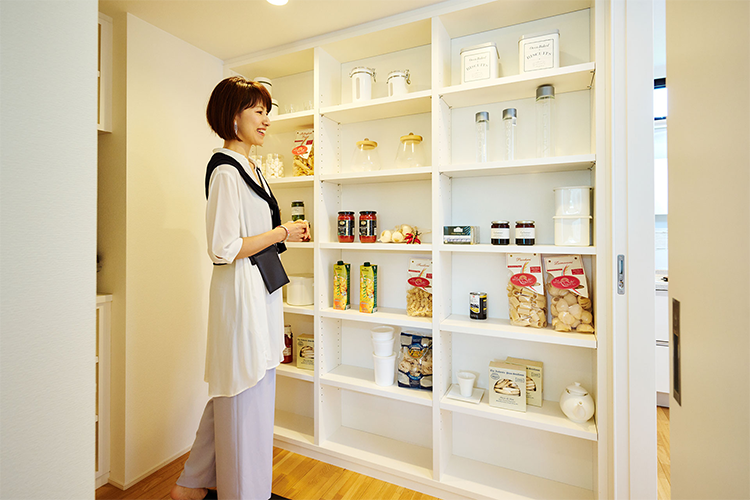 収納力抜群のウォークインパントリーは、料理好きの奥様にとっては夢のスペース。パントリーを挟んで、キッチンと洗面室がつながっている動線も便利です。