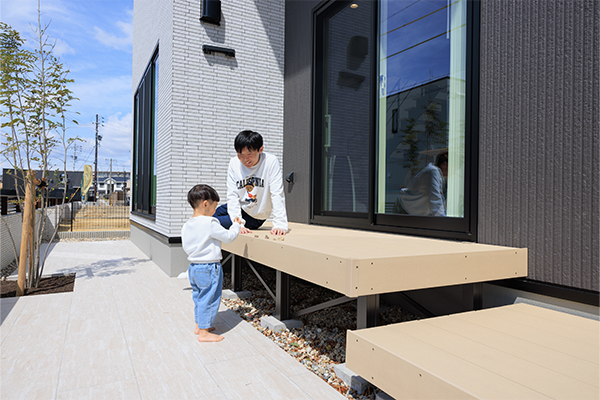 ダイニングから直結したデッキへ出れば、気軽に外の空気と触れ合えます。子どもの遊び場としても活躍してくれそうなお気に入りの場所に。