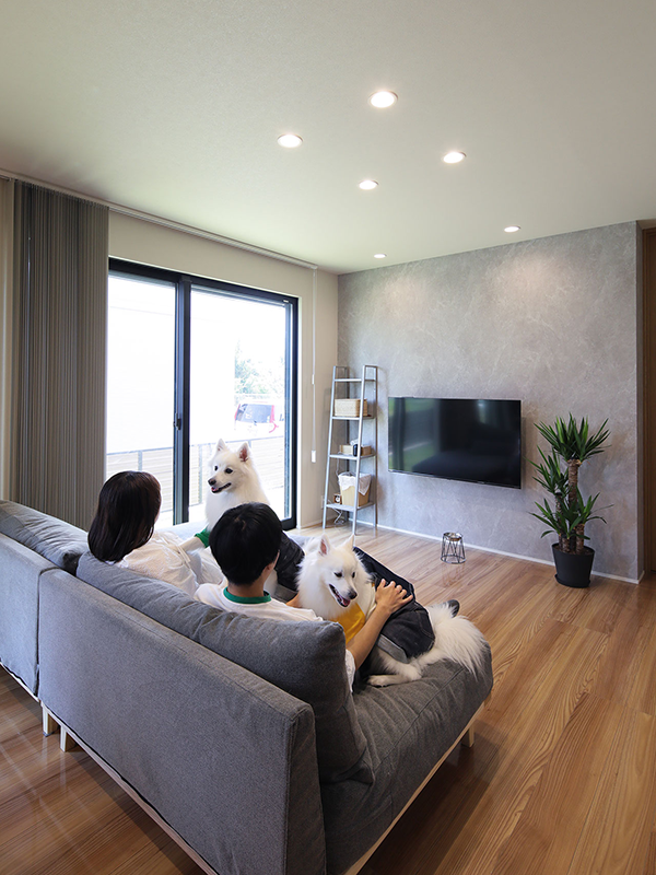 ご夫婦と愛犬2匹で一緒にくつろげる大きなソファを配置したリビング。