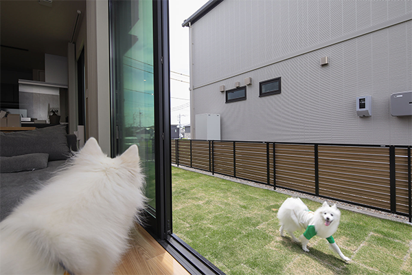 家屋の右側には、天然芝の庭を設けてドッグランとして活用。