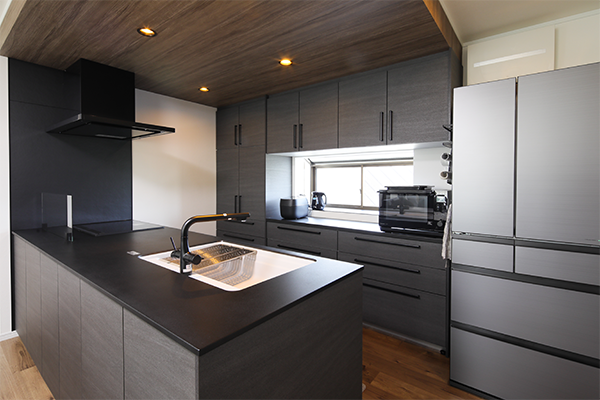 キッチンだけダークトーンでまとめることで、LDKの中でキッチンが強調される見え方に。