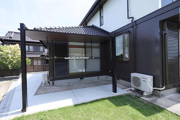 裏庭に屋根付きのテラスを新設することで、雨でも洗濯物の外干しが可能に。