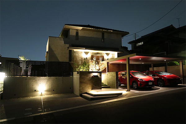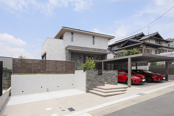 外構部には、カーポート付きの駐車場に加え、お客様用に約2台分の駐車スペースも確保。来客が多いという家主さんならではの気配りです。