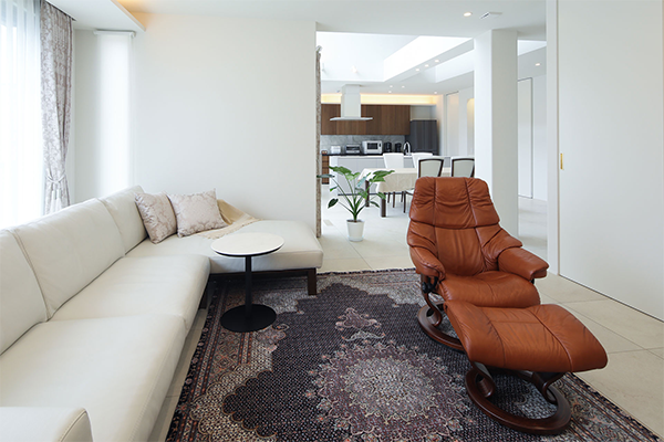 インテリア選びのセンスが光るリビング。LDKがひとつなぎの空間ながら、リビングはどこかプライベート感のある雰囲気が漂います。