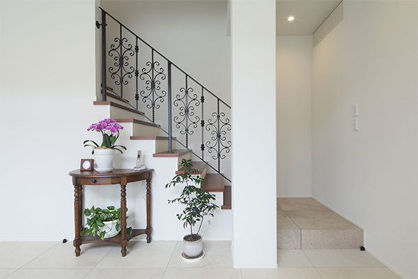 ホワイトを基調とした空間の中に、階段の手すりのブラックやタイルのグレーなどの差し色が効果的。インテリアや家具が自然と映えるLDKです。