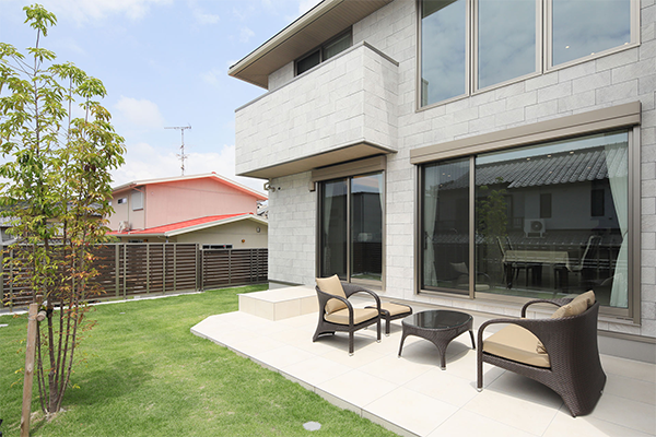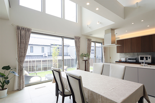 ダイニング横の大きな窓から見えるのは、広いテラスとお庭。テラスの高さを芝に近い“低めに”設定することで、庭を広く感じさせる効果があるそう。