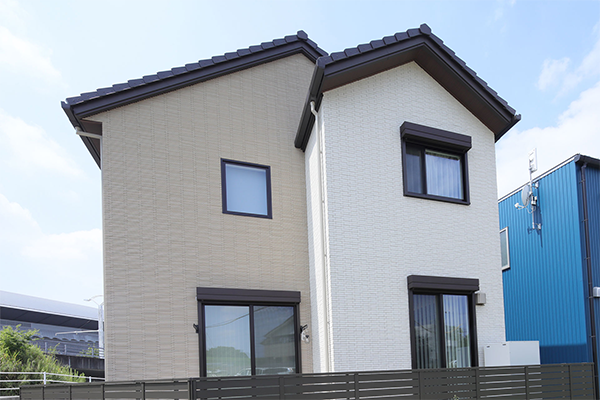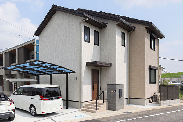 ホワイトとベージュのツートーンで構成された外観。土地の場所や形状を上手く生かし、建物と駐車場を配置した住まいです。
