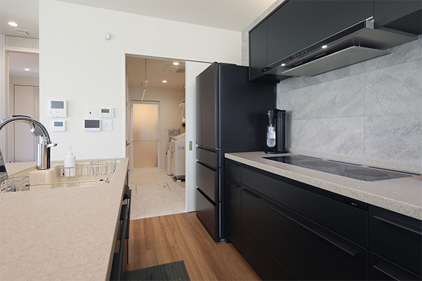 1階は家事動線の便利さを考慮した回遊性の高い空間。キッチン、ランドリールーム、バスルームが横並びで、どこにいても目が行き届きます。