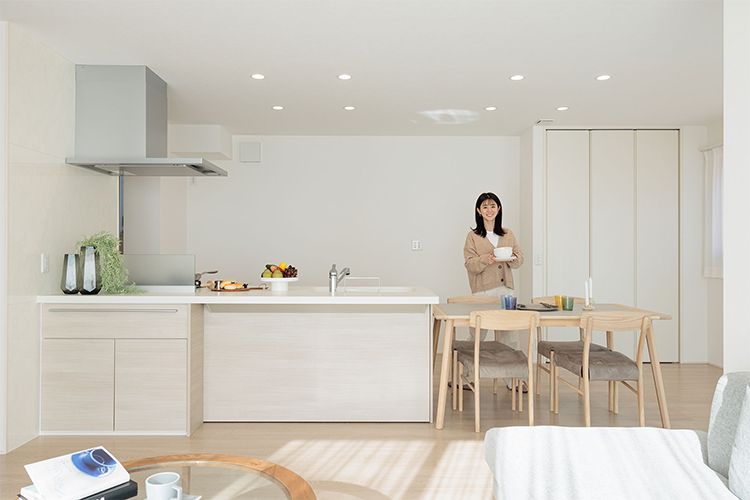 キッチンまわりは、パントリー・キッチン・ダイニングを横並びにレイアウトし、家事がはかどる無駄のない動線を実現。リビングからパントリーは死角になっているので、来客時にも中が見えることがなく安心です。