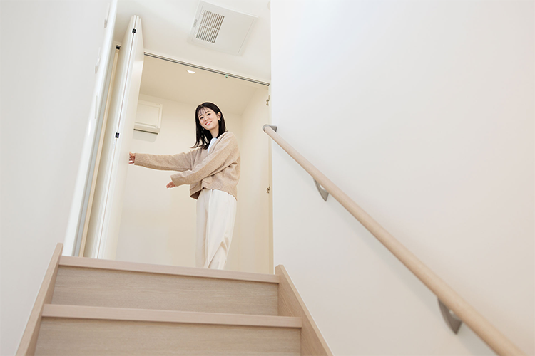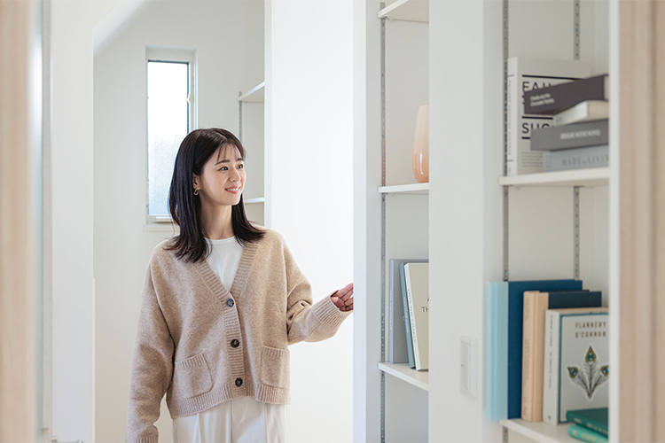 主寝室にはウォークインクローゼットも設けられているので、夫婦の洋服やバッグなどをたっぷり収納。階段を上がった目の前にあるサービスルーム(納戸)は、扇風機や暖房機器などの季節の荷物や、掃除機をはじめとした大きめの荷物(家電)を入れるにぴったりと“収納力の高さ”も注目すべきポイントです。