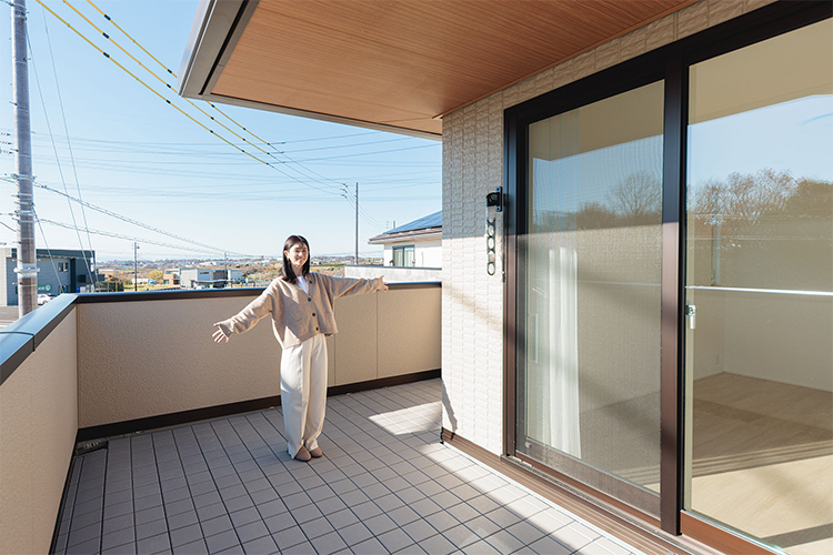 2階に上がると、主寝室の横に広いバルコニーが。大きく屋根が被っているワイドバルコニーになっているので、小雨程度なら洗濯物を干すこともできるほか、アウトドアリビングとしての可能性が広がる十分な広さを持ち合わせています。