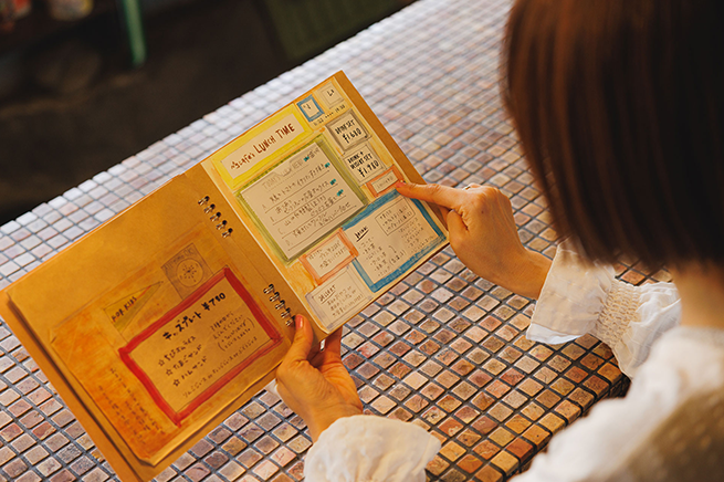 外観は、純日本家屋。中に入ると、まるで古い学校の校舎のようなどこか懐かしい雰囲気。天井には無数の星の照明が吊ってあり、インテリアの雰囲気も、飾られた雑貨の雰囲気もさまざまながら、不思議と居心地の良さを感じます。カラフルなタイル張りのカウンター席は、横並びで2席ずつのまるでカップルシートみたいで、デートにもぴったり。