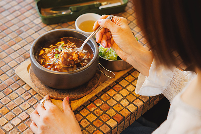 手書きのメニュー表を見ていると、フードメニューの充実ぶりに驚きます。ランチメニューだけでも、この日は4種類。中でも、石釜を使ったごはんメニューが名物とのこと。注文した「あつあつビーフシチューの石釜オムライス」は、最後まで熱々でおいしくいただけました。
