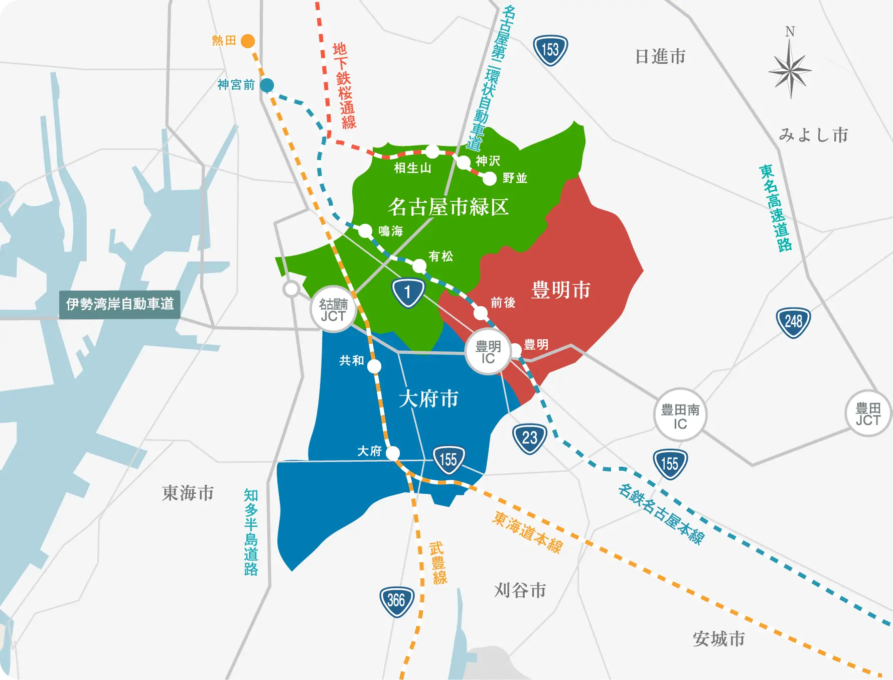 緑区・豊明市・大府市は、様々な交通網が密集する、利便性の高いエリアです。