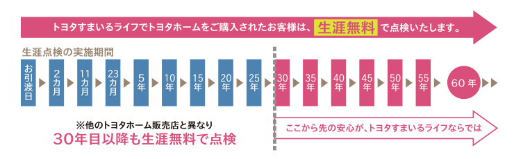 新築時の快適と安心をずっと。60年長期保証と生涯無料点検を約束。 “工場で家をつくる”にこだわる。 トヨタホームが目指すのは、家族の想いに寄り添い、それぞれの理想をかなえる高品質な住まいづくり。工場生産と聞くと、同じものの大量生産を想像される場合があるようですが、トヨタホームはオーダーメイドの完全邸別生産。例えば、歴史的な建造物などは、つくる工程で雨風などから住まいを守るため、屋根の下でつくられます。 私たちが工場で家をつくるのは、そんな伝統のものづくりの姿勢と同様に、一邸一邸、丁寧に。真心を込めて、設計通りにつくるため。そして、自由な間取り・空間をデザインするため。いつまでも新築時の快適を維持するため。 トヨタホームは「工場で家をつくる」にこだわります。 私たちが工場で家をつくる3つの理由 高品質は施工環境で決まるから。 家づくりの質は天候や施工場所に左右されます。 雨などによる部材の劣化を防ぎ、常に安定した品質をお届けしたい。 トヨタホームは一邸一邸ごとに建材を仕入れて管理し、職人の技と先進のテクノロジーを発揮できる環境を工場内で実現しています。 住性能の高い家をつくりたいから。 「自由な間取り」と「耐震性」を兼ね備えた家をつくりたい。 トヨタホームの結論は、工場ならではの精密な 溶接で剛接合される「鉄骨ラーメンユニット構造」。 業界トップの125mm角の柱と梁だけで強固な基本構造が成立するため、耐震性のバラツキがなく間取りの自由度も高くなり 大空間や大開口の住まいも実現できます。 ずっと長持ちで永く愛される家でありたいから。 トヨタホームは、20年30年経っても新築時の性能を長持ちさせたい。そのために、業界初の初期保証40年を実現し、最長60年保証のメンテナンスプログラムを用意しています。 これは、長年経っても住性能が高いからこそできる保証体制。さらにリフォームもしやすく、保証を引き継げることで、将来の住み継ぐ世代の快適も叶えます。 トヨタホーム全販売店で唯一の生涯無料点検で「人生をごいっしょに。」 そこに住まいがある限り、ずっと変わらないお付き合い。 ご入居いただいてからが本番。家族の暮らしを大きく育てたいからこそ、充実の体制で、お客様の暮らしをサポートいたします。トヨタホーム&LiFEはコールセンターやアフターサービスなどの機能が自社内ですべて整っており、迅速な対応で相談を承ります。トヨタホームの60年長期保証システムに加えて、トヨタホーム&LiFE独自のサポートシステムで安心を提供いたします。 生涯無料点検制度 通常のトヨタホーム販売店は、ご入居いただいてから30年目以降、5年ごとの定期点検は有償点検に切り替わりますが、トヨタホーム&LiFEは住まいがある限り一生涯にわたって無償で点検を行います。有償となると、点検をないがしろにしてしまうケースも考えられますが、クルマも定期的に車検を通すように、住宅も点検そして、最低限のメンテナンスは必要不可欠です。永きにわたってお住まいいただくために、弊社では生涯無料点検をお約束します。 マイホーム売却支援 お住み替えやお引越しなどの諸事情により、お客様が住まいを手放さなくてはならない場合、売却のサポートはもちろん、その後、一定期間内に売却が進展しない場合はトヨタホーム&LiFEが「お客様の住まいを買取する」ことを選択できます。 ※長期保証について60年長期保証は、トヨタホームシンセシリーズ・LQ・エスパシオシリーズご購入の「アトリスプラン60年長期保証制度」対象のお客様のみのサービスとなります。60年長期保証は、「初期保証+保証延長」の合算期間で、保証延長にはご契約されたトヨタホーム販売店が実施する定期的な点検と適切なメンテナンス・補修が必要となります。保証期間や内容の詳細についてはスタッフにお問い合わせください。