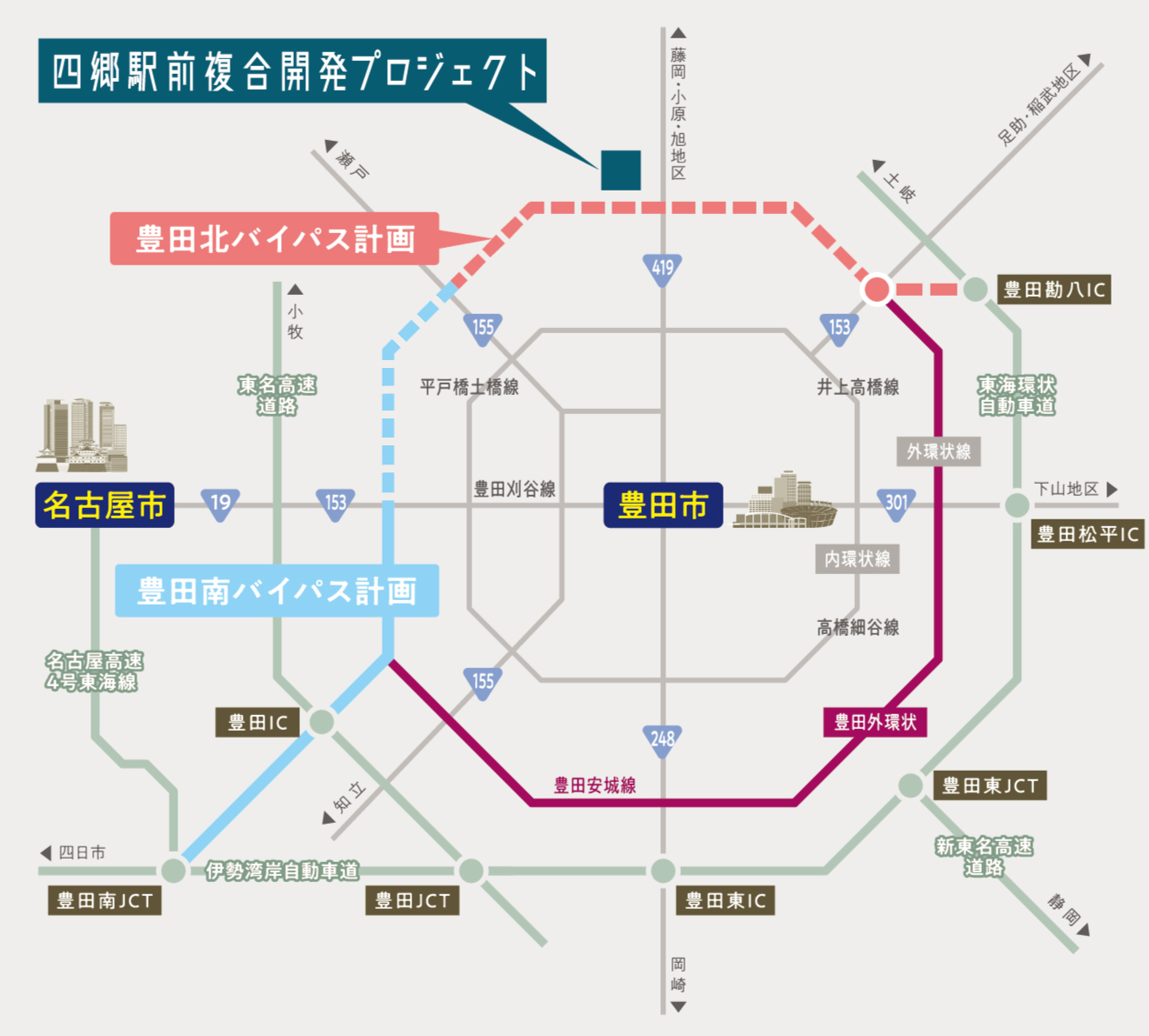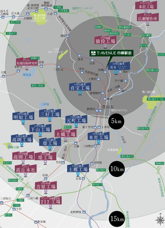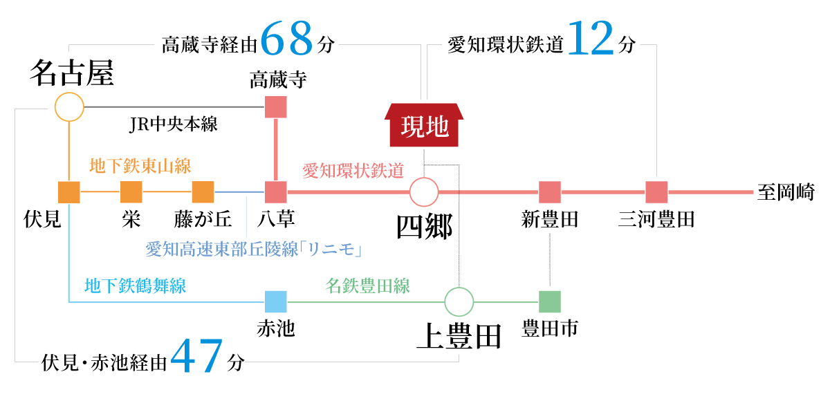 電車通勤もこれからは選択肢。朝・夕の渋滞回避でストレスのない暮らし。 愛知環状鉄道「四郷」駅徒歩2分~5分 駅まち一体開発の四郷駅前の区画整理事業。トヨタホームの戸建街区は、区画整理地内でも比較的、駅に近いエリアであるため、公共交通機関を使って市内や都心部へアクセス。車を所持されないライフスタイルの方でも安心です。 愛知環状鉄道「新豊田」駅 四郷駅より乗車5分 愛知環状鉄道「三河豊田」駅 四郷駅より乗車12分 to NAGOYA 2駅2路線利用可能なロケーション。「上豊田」駅から名古屋駅へ47分。 T-AVENUE四郷駅前より、名鉄豊田線「上豊田」駅まで徒歩18分(1,370m)~徒歩22分(1,760m)。名古屋方面への通勤やおでかけ、将来のお子さまの通学など、多彩な交通網はあなたの暮らしに彩りを加えます。 赤池駅 上豊田駅より直通15分 八事駅 上豊田駅より直通25分 伏見駅 上豊田駅より直通41分 名古屋駅 上豊田駅より47分 ※距離表示については、地図上の概測距離をもとに算出しており、所要時間は徒歩は分速80m、車は時速40kmで計算しております。車や徒歩の信号待ち時間は含まれておりません。掲載の鉄道マップは各路線と主要駅を基に作成した概念図です。鉄道の乗車時間は平日通勤時(8:00前後)の時間にて算出しており、乗換にかかる時間(伏見駅での乗車待ち時間)を含みます。 将来的な豊田外環状の完成で、カーアクセスの可能性はさらに広がる。 新豊田駅 車で7分(4.3km) 豊田勘八IC 車で7分(4.2km) 名古屋駅 車で42分(39.4km)※高速道路利用 中部国際空港セントレア 車で56分(70km) ※高速道路利用 to FACTORY トヨタ関連企業をはじめ、豊田市内の主要な工場へも快適に。 トヨタ自動車本社…車14分(8.8km) トヨタ自動車花本 テクニカルセンター…車2分(1.2km) トヨタ自動車貞宝工場…車8分(4.7km) トヨタ自動車元町工場…車12分(7.7km) トヨタ自動車三好工場…車14分(9.0km) トヨタ自動車下山工場…車16分(10.6km) トヨタ自動車明知工場…車17分(11.2km) トヨタ自動車堤工場…車18分(11.5km) トヨタ自動車上郷工場…車19分(12.2km) トヨタ自動車高岡工場…車20分(13.0km) トヨタ紡織猿投工場…車3分(1.5km) デンソー広瀬製作所…車12分(7.6km) アイシン化工本社工場…車18分(11.7km トヨタ紡織土橋工場…車15分(9.5km) デンソー先端技術研究所…車16分(10.2km) トヨタ紡織堤工場…車19分(12.6km) トヨタ紡織高岡工場…車23分(14.9km) アイシン高丘 本社…車24分(15.5km) トヨタ車体吉原工場…車24分(15.5km) デンソー安城製作所 /212工場…車25分(16.4km) 周辺道路は現在整備が進められており、渋滞の緩和が期待されます。 四郷エリアから南北にのびる国道419号線の複線化工事が現在進行中。発展が進む四郷エリアの交通網が再整備され、豊田市街や藤岡方面へも、ストレスなくアクセス可能になります。 ※距離表示については、地図上の概測距離をもとに算出しており、所要時間は徒歩は分速80m、車は時速40kmで計算しております。信号待ちの時間などは含まれておりません。高速道路IC間の所要分数・距離は「ドラぷら(NEXCO東日本)」ホームページにて検索(2021年9月現在)したものです。掲載の交通アクセスMAPは概念図であり、実際の地図とは異なります。