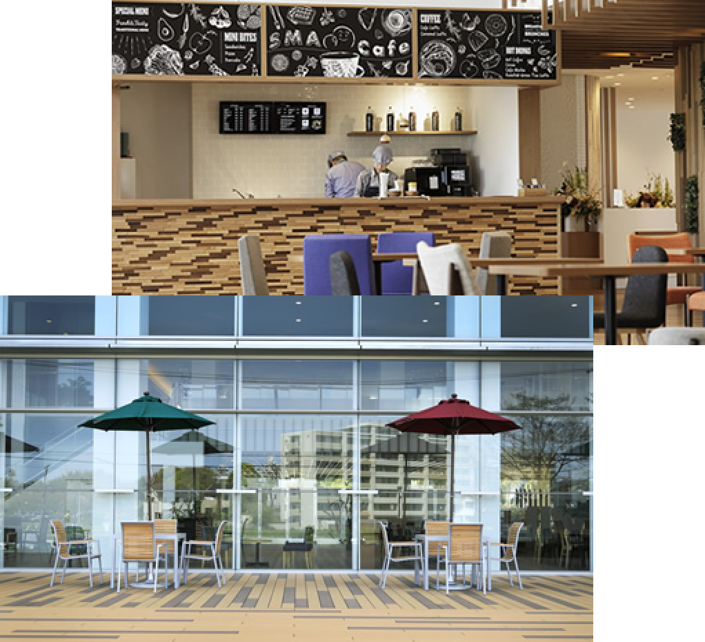 館内と屋外、どちらからもご入店いただける「SMA Café」は、心地よい空間と開放的なテラスが特徴のゆったりくつろげるカフェです。コーヒーや軽食などの定番メニューに加え季節のスペシャルメニューもご用意し、いつご来店いただいても新鮮なご気分で楽しんでいただけるカフェを目指しております。もちろん館内へお立ちよりいただいたお客様にもご利用いただけます。