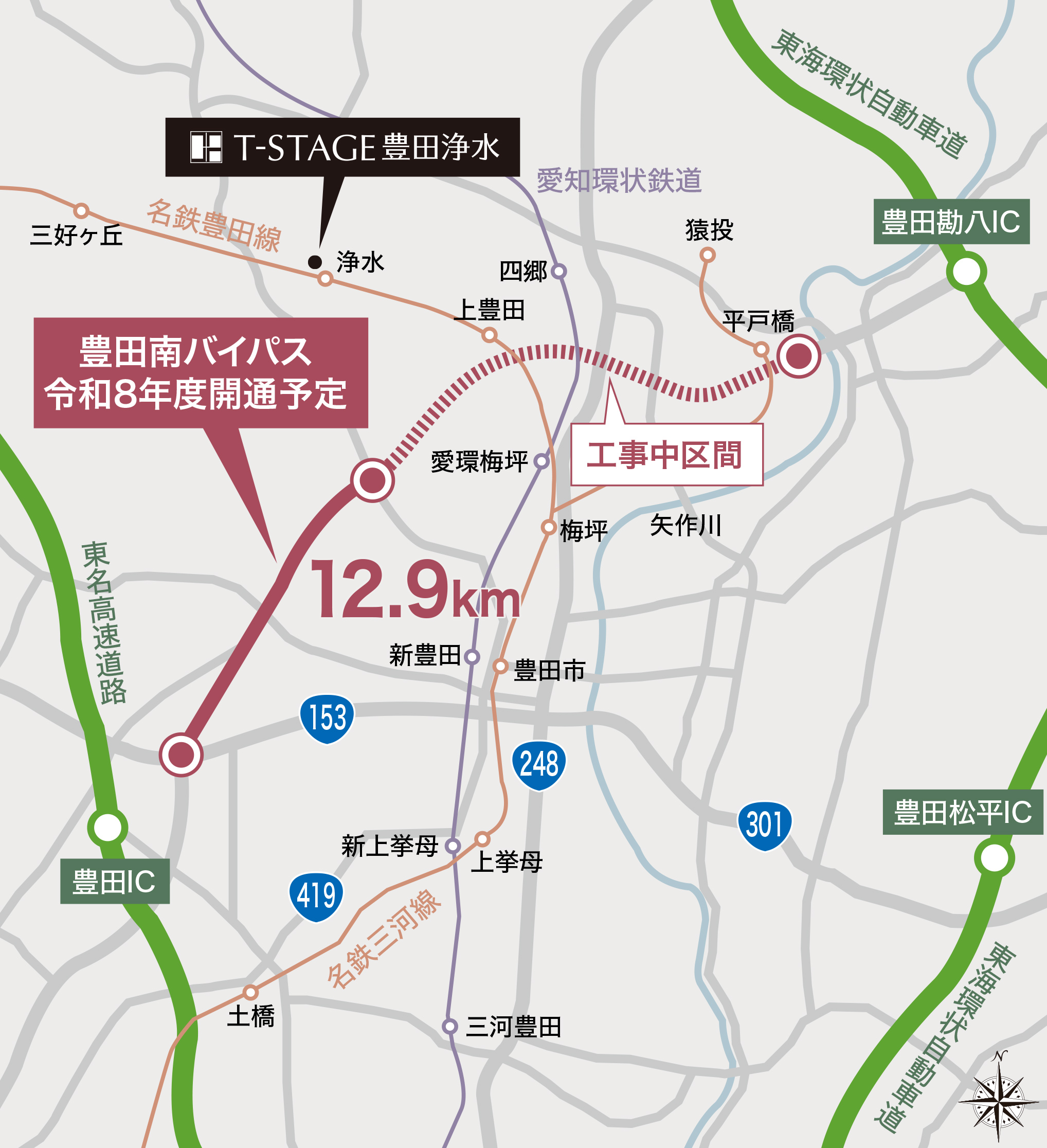 国道155号豊田南バイパスは、豊田市中心部の周辺を環状に結ぶ豊田外環状道路の一部を構成する延長12.9kmの道路です。これまでに、豊田市駒場町から東新町間(延長9.2km)が開通(一部暫定開通)しているところですが、今回、豊田市東新町~逢妻町間(延長3.7km)が令和8年度に開通(予定)し豊田南バイパスは全線開通となります。