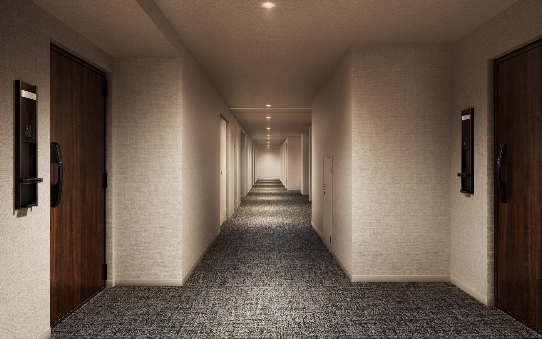内廊下完成予想CG/6F 内廊下設計ホテルに住んでいるような⾼級感を得られるだけでなく、プライバシーの保護やセキュリティ性に優れ、安⼼して暮らすことができます。